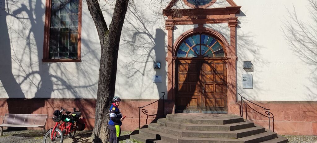 Nun ging es nach Kaiserslautern zu der kleinen Kirche. Diese erinnert an den Zusammenschluss zweier evangelischen Gemeinden. Auch hier hält der Marathon jährlich. Leider beim ersten Mal nicht gefunden, so eine extra Runde gefahren. Dann aber schön in der Sonne gesessen.